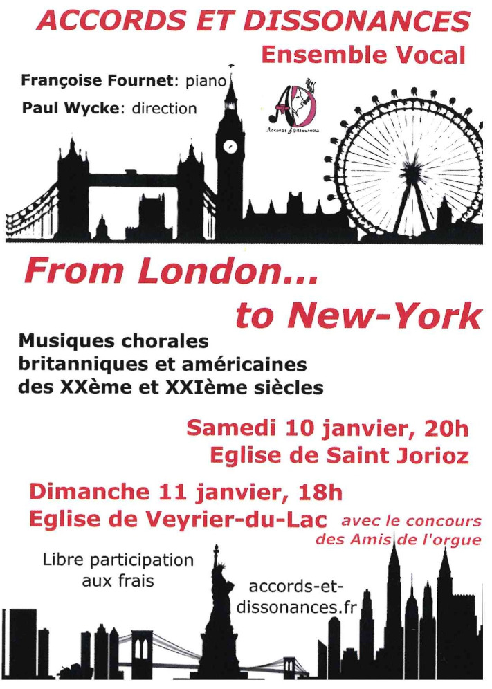L’ensemble vocal Accords et Dissonances vous propose un programme de musiques chorales britanniques et américaines des XXe et XXIe siècles, témoignant de la vitalité actuelle de la musique chorale anglo-saxonne, de part et d’autre de l’Atlantique, avec une production stimulée par la tradition toujours vivace des maîtrises dans les collèges britanniques et des chœurs des universités américaines. Une musique assumant l’héritage de la polyphonie des siècles précédents tout en intégrant l’influence des musiques d’aujourd’hui.
