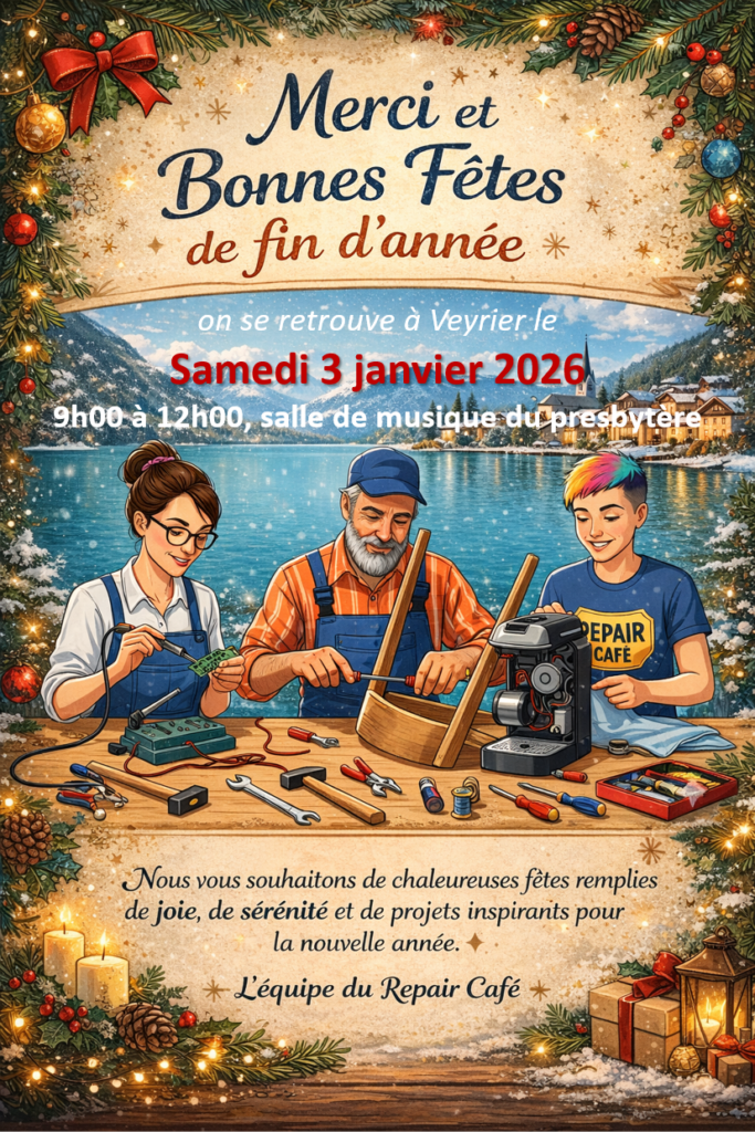 Les bénévoles du Repair Café vous donnent rendez-vous samedi 3 janvier 2026, de 9h à 12h,  salle de musique du presbytère de Veyrier-du-Lac.